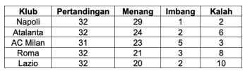 Berikut ini adalah tabel klasemen sementara lima klub teratas di Liga Seri A Italia tahun 2022. Setiap klub melakukan tepat dua pertandingan dengan setiap tim lain di mana terdapat 20 klub yang bermain di Liga Seri A. Poin yang diberikan di bawah ini adalah setelah klub memainkan sekitar tiga puluh pertandingan.Untuk setiap kemenangan, klub akan mendapatkan nilai 3 poin, imbang 1 poin, dan kalah 0 poin. Total banyaknya pertandingan di Liga Seri A Italia adalah pertandingan.